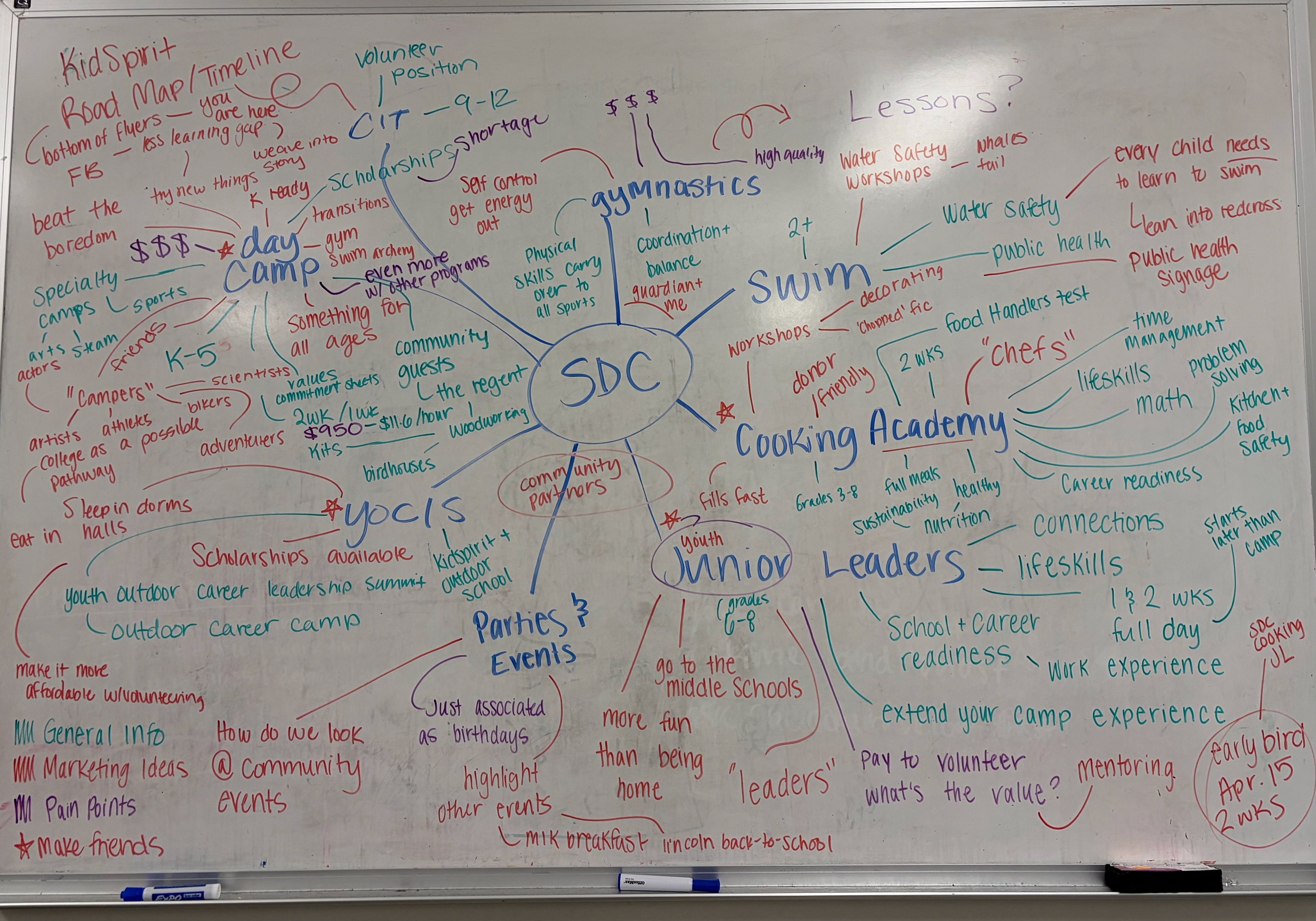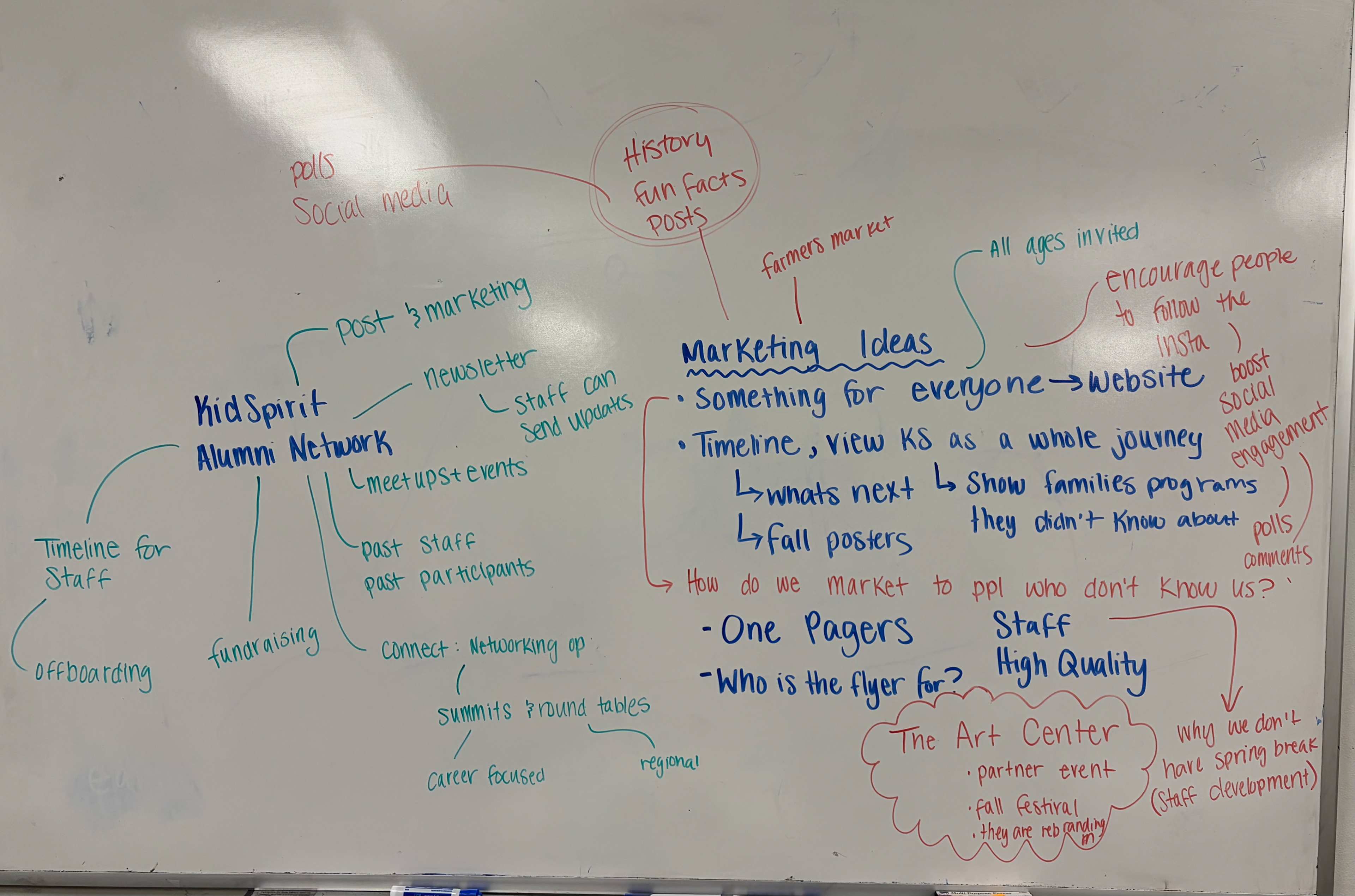 To market KidSpirit it is essential to understand the many aspects of the organization. The organization caters to all-ages, and offers a wide range of programs. It also isn't just a youth programming agency, KidSpirit's mission also is to help their staff develop professionally. The whiteboards below show the end results of a brainstorming session the KidSpirit marketing team conducted to help us better understand everything our marketing materials needed to encompass.