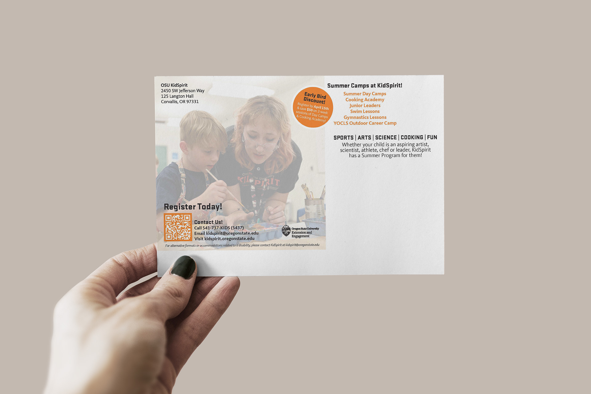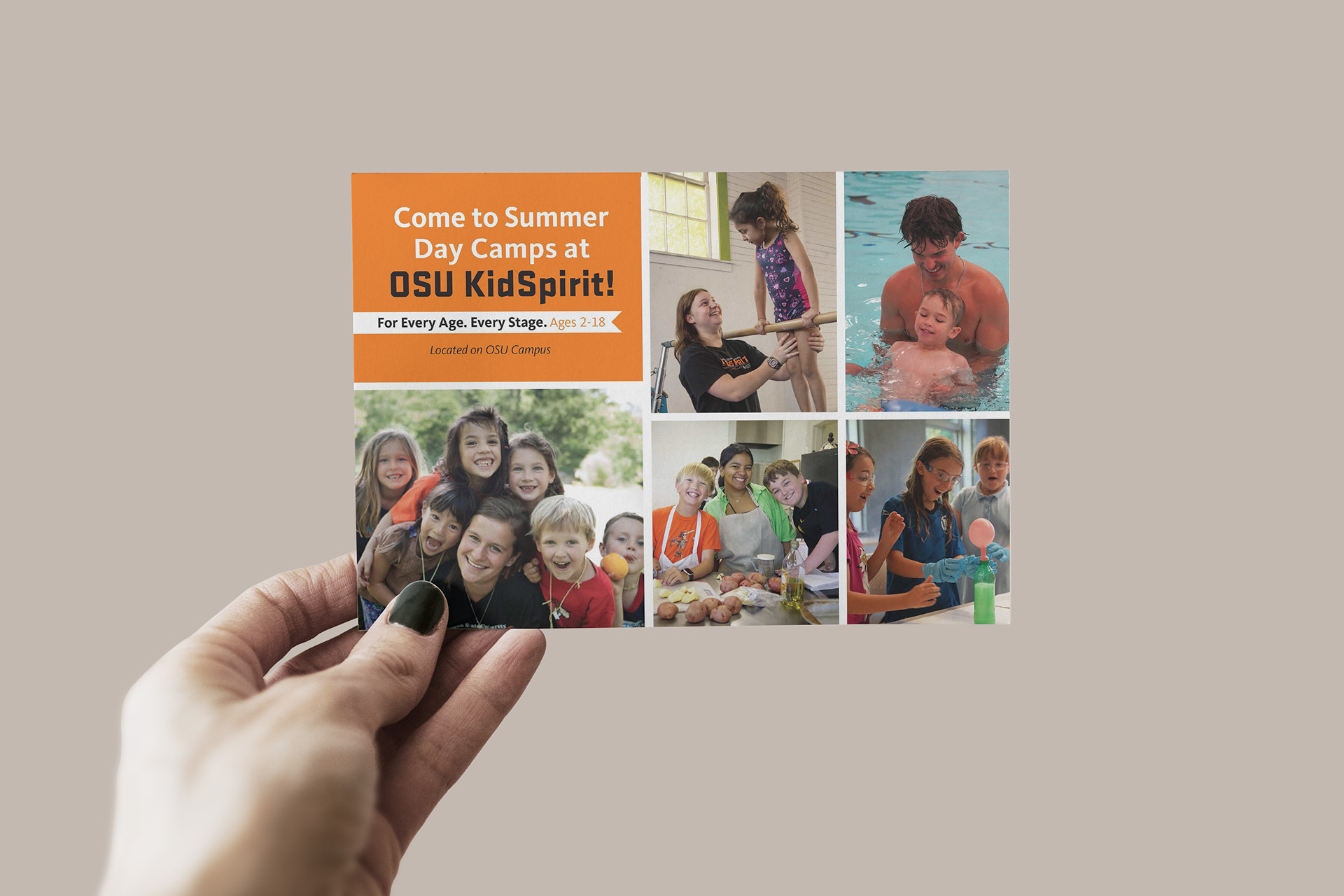 Below are some of the deliverables created to advertise KidSpirit's 2026 Summer Programs. Shown below is the Summer Program postcard which was sent to families of children currently in a program at KidSpirit. The main objective was to show the wide-range of activities KidSpirit offers to a wide-range of children.